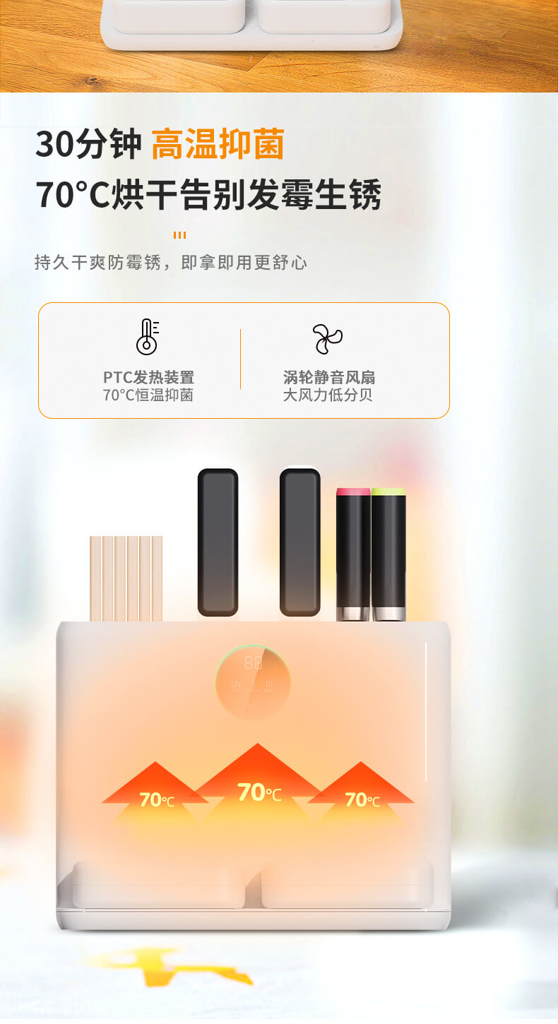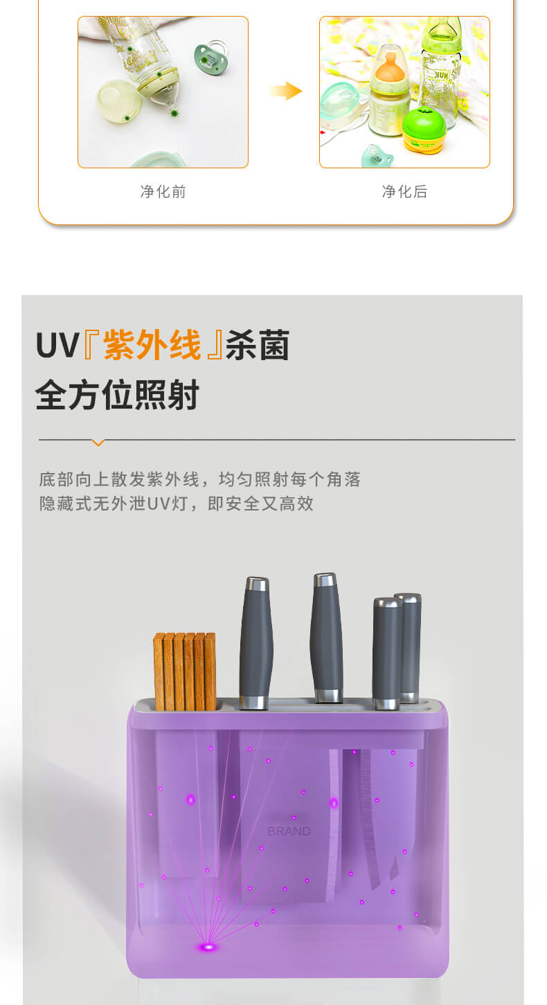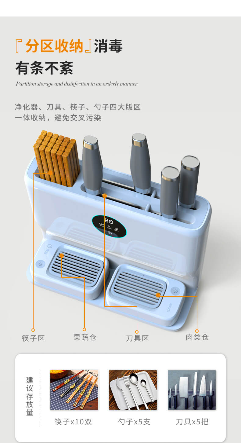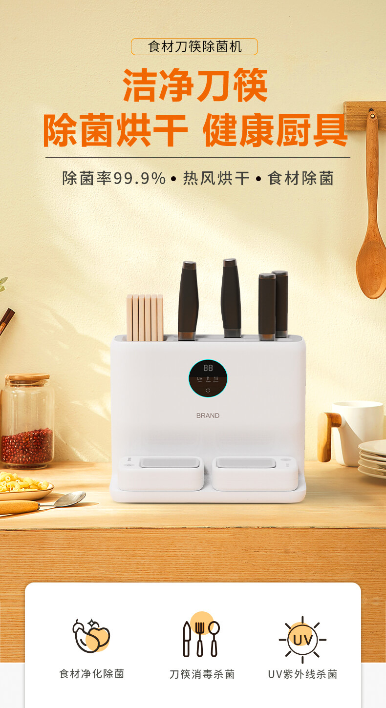 四、隱藏式無外泄UV燈,徹底消殺刀具、筷勺隱藏細菌,雙重烘干系統(tǒng),保障刀具筷勺不留水漬,抑制霉菌、細菌等有害物質(zhì)滋生;