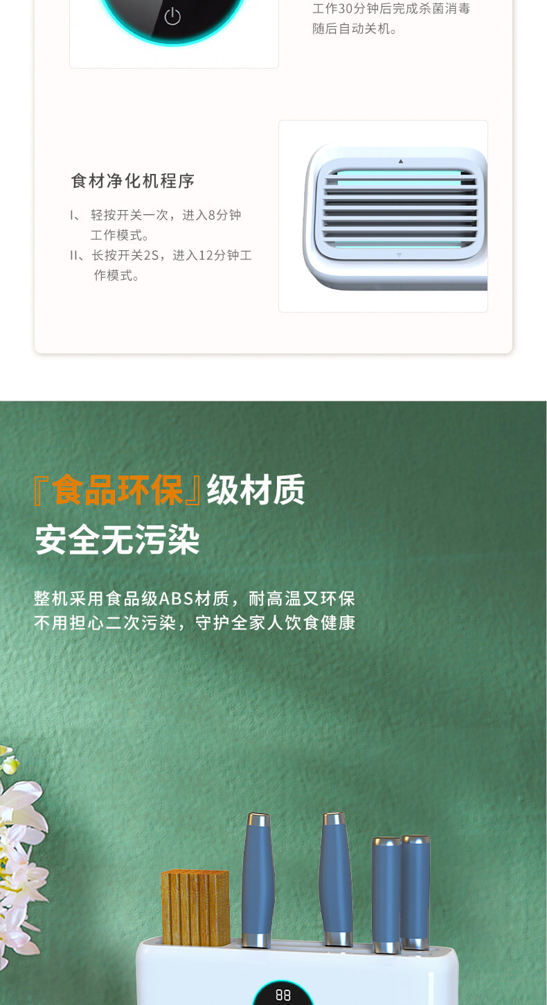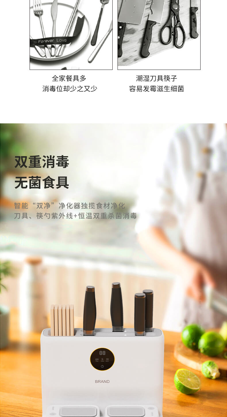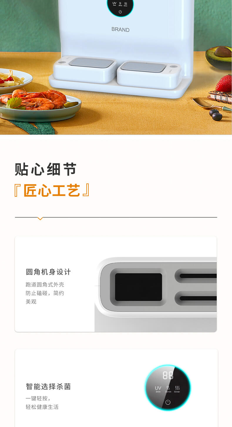 四、隱藏式無外泄UV燈,徹底消殺刀具、筷勺隱藏細菌,雙重烘干系統(tǒng),保障刀具筷勺不留水漬,抑制霉菌、細菌等有害物質(zhì)滋生;