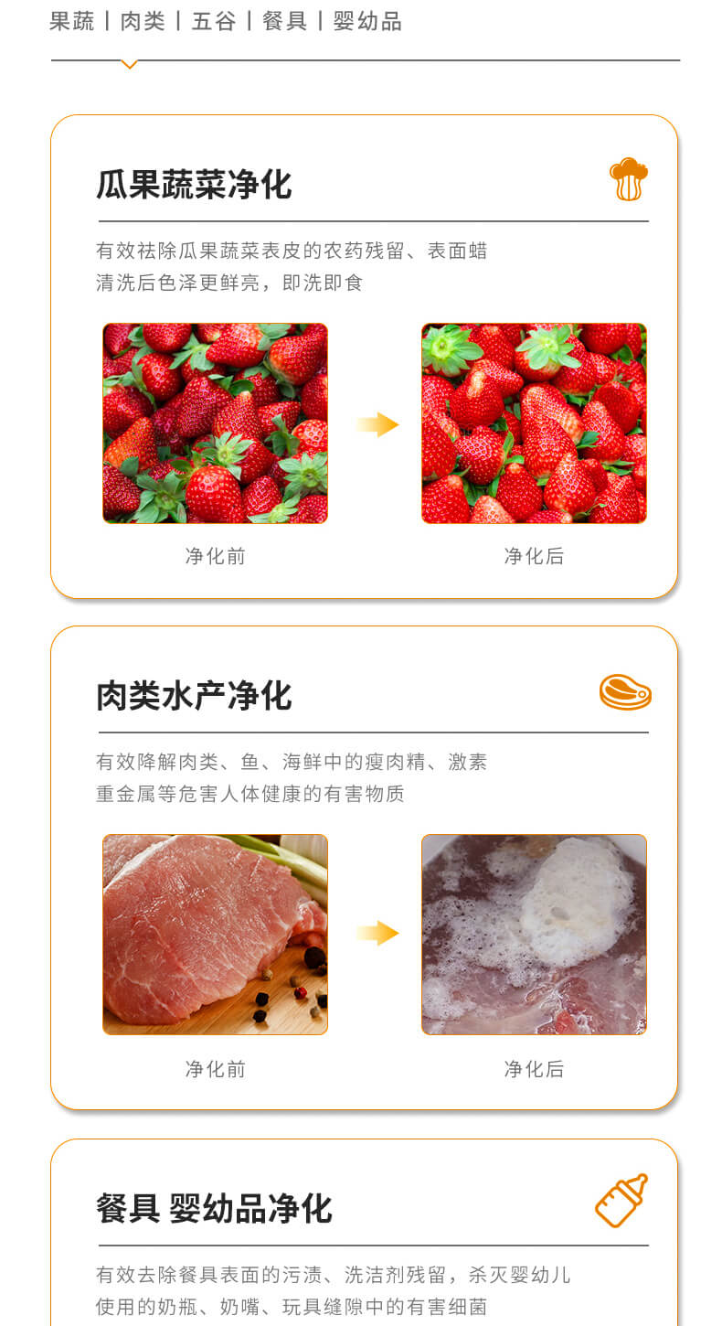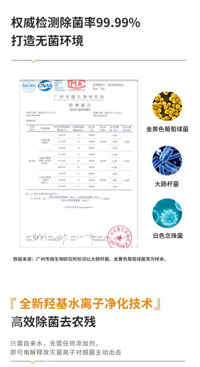 二、創(chuàng)新羥基水離子凈化技術(shù),無添加無副作用,有效祛除果蔬、肉類、五谷、餐具表面農(nóng)藥殘留、技術(shù)等有害物質(zhì);