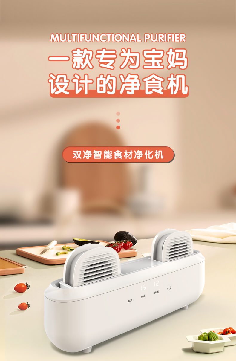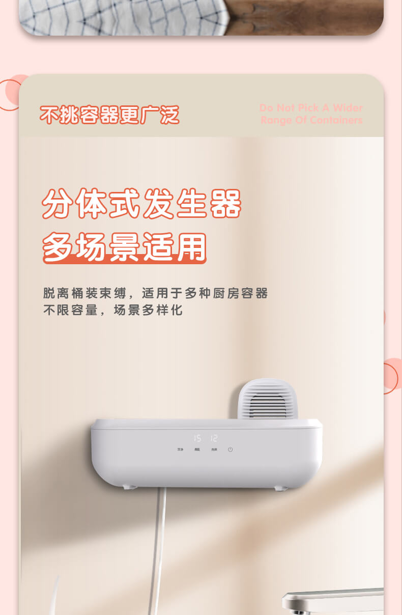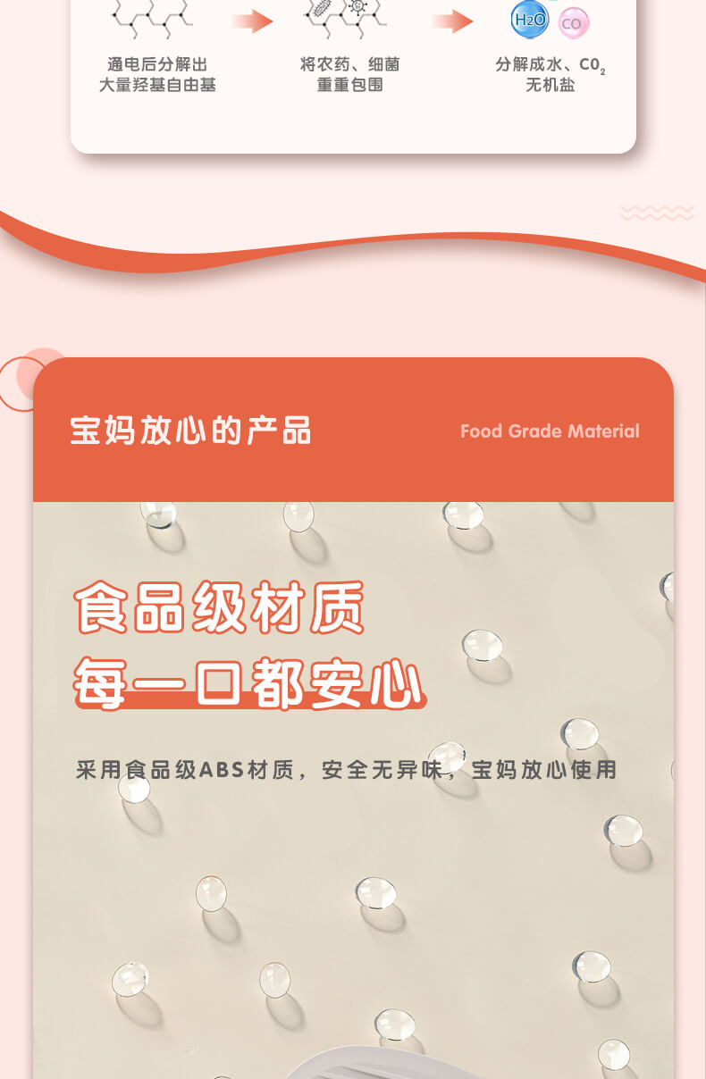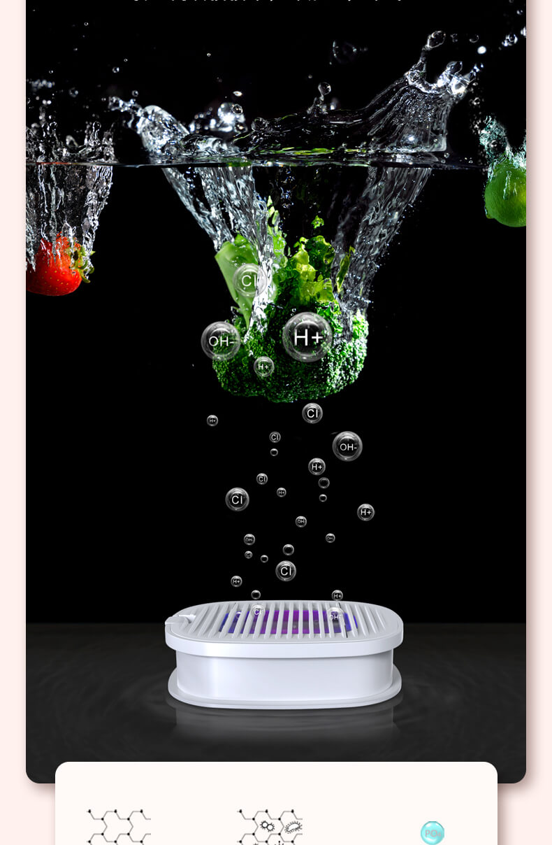 一款專為寶媽設(shè)計(jì)的凈食機(jī),原創(chuàng)雙凈同時(shí)凈化,節(jié)省時(shí)間,無需等待。采用新一代刀片電極技術(shù)、以水為原料不添加任何化學(xué)物質(zhì),通電后產(chǎn)生粒子,使水分子裂解為羥基自由基具有強(qiáng)氧化能力,能有效的降解食材表面的細(xì)菌、農(nóng)殘、激素等有害物質(zhì)。水在離子發(fā)生器的作用下分解成OH-和H+;分解的一部分OH-將農(nóng)藥和細(xì)菌細(xì)胞壁上的H+奪走并重組,形成無害物質(zhì);另一部分OH-和水中氯結(jié)合生成次氯酸,通過氧化反應(yīng)降解殺滅細(xì)菌。