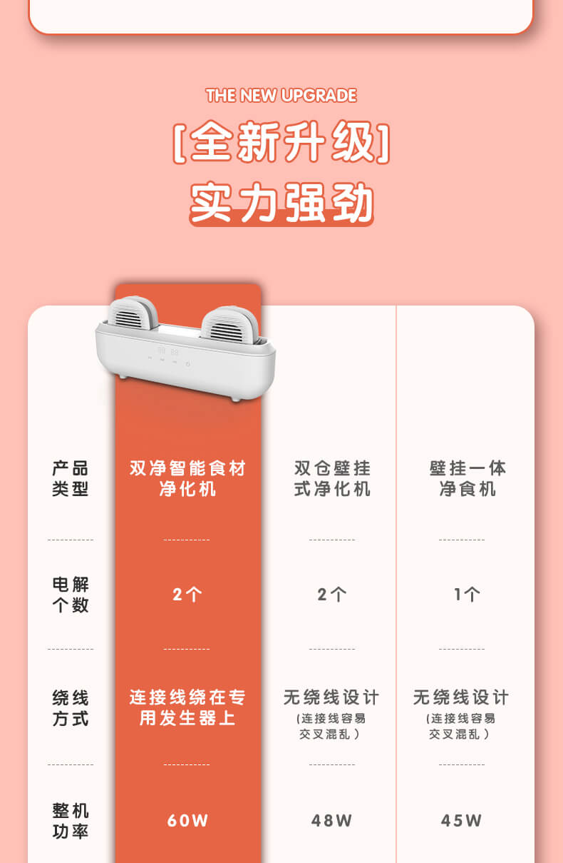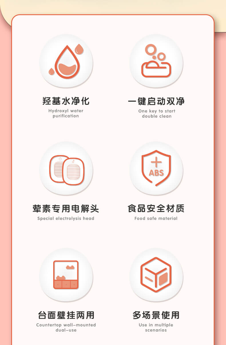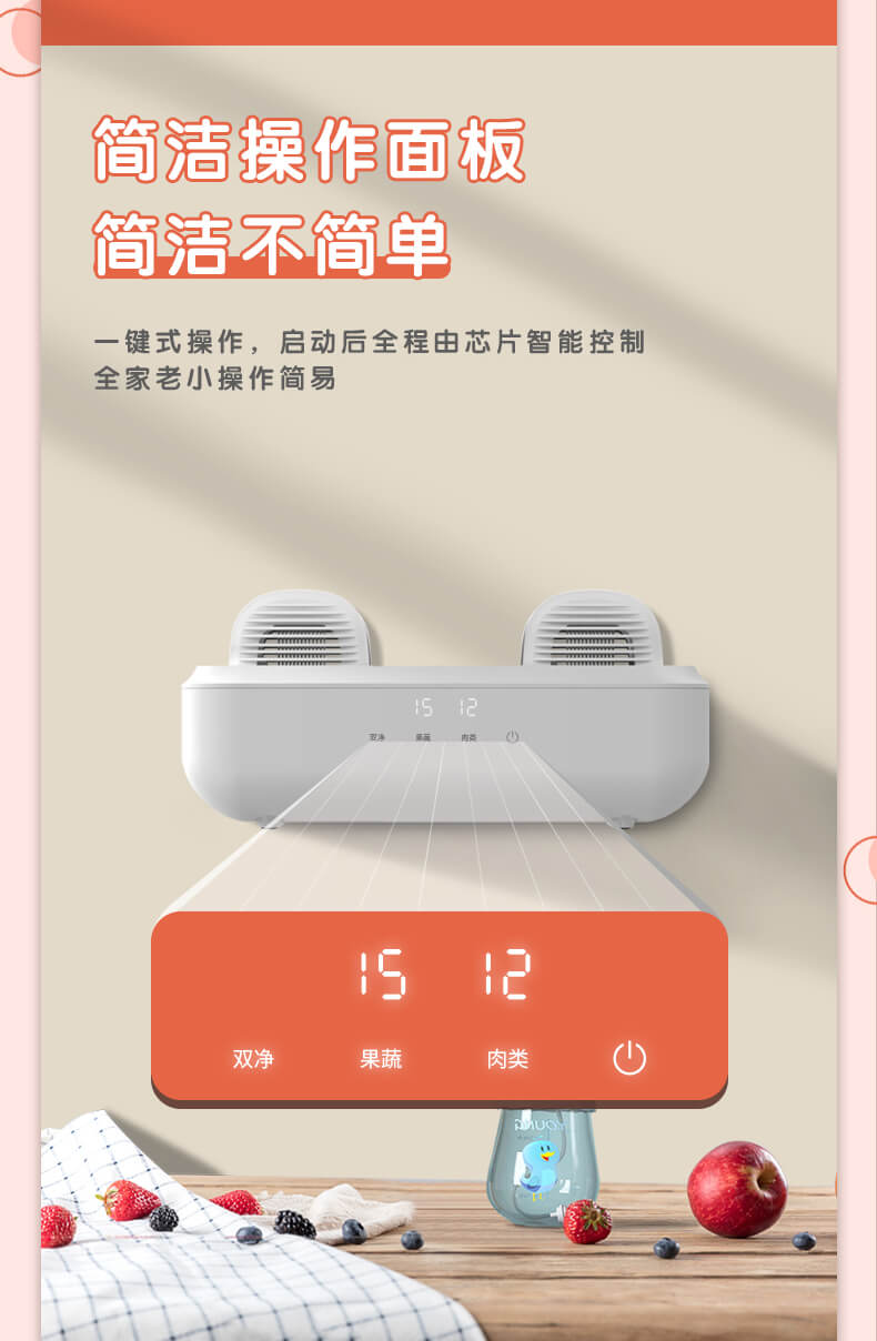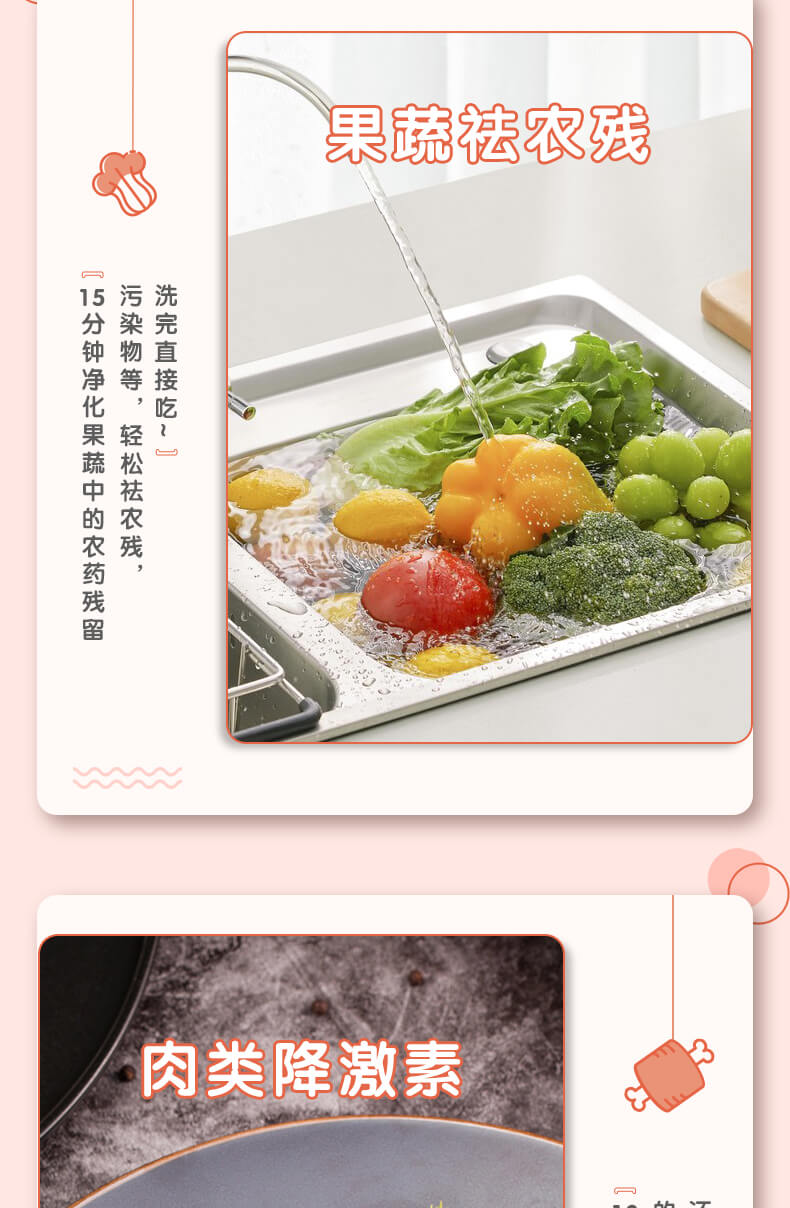 一款專為寶媽設(shè)計(jì)的凈食機(jī),原創(chuàng)雙凈同時(shí)凈化,節(jié)省時(shí)間,無需等待。采用新一代刀片電極技術(shù)、以水為原料不添加任何化學(xué)物質(zhì),通電后產(chǎn)生粒子,使水分子裂解為羥基自由基具有強(qiáng)氧化能力,能有效的降解食材表面的細(xì)菌、農(nóng)殘、激素等有害物質(zhì)。水在離子發(fā)生器的作用下分解成OH-和H+;分解的一部分OH-將農(nóng)藥和細(xì)菌細(xì)胞壁上的H+奪走并重組,形成無害物質(zhì);另一部分OH-和水中氯結(jié)合生成次氯酸,通過氧化反應(yīng)降解殺滅細(xì)菌。