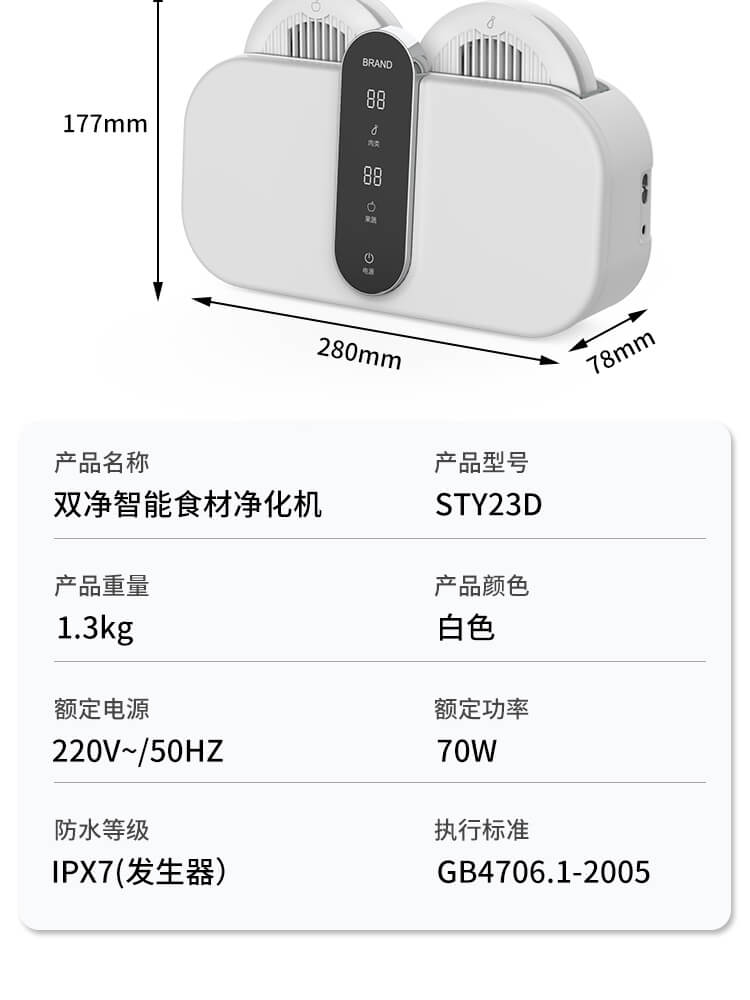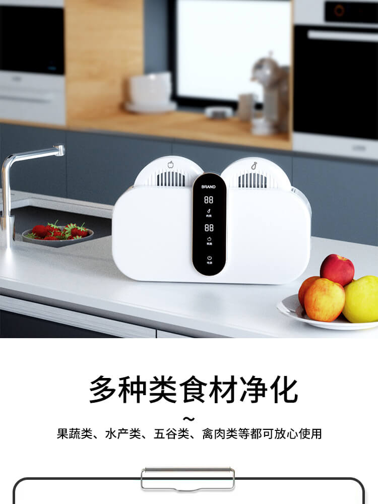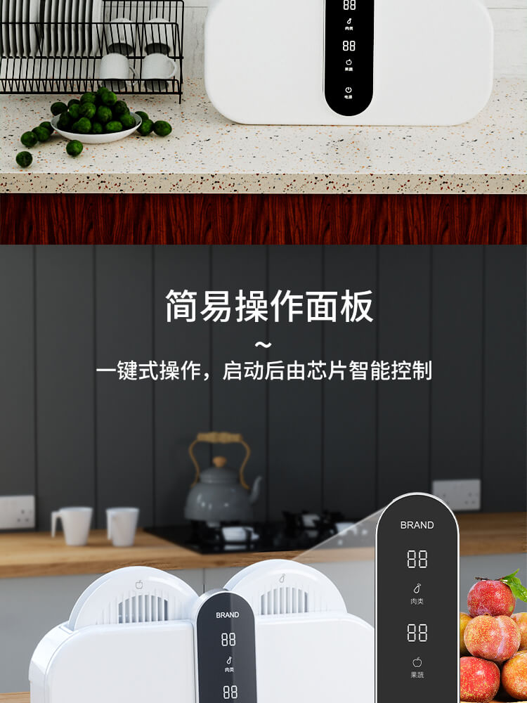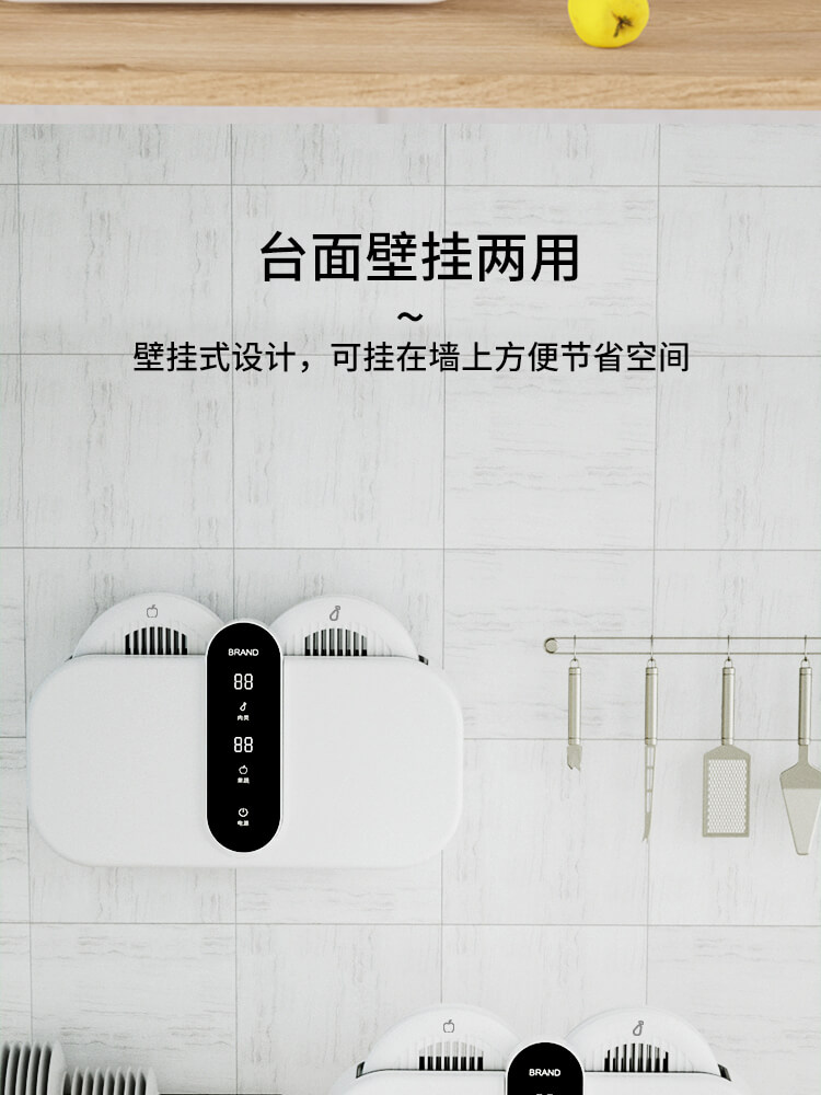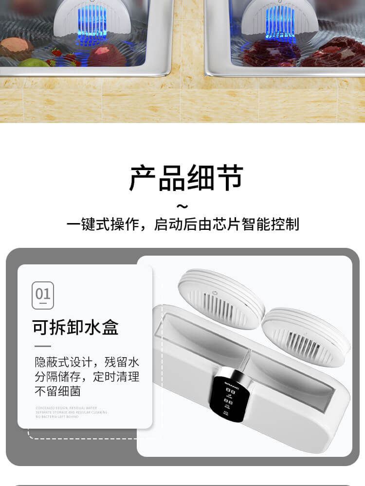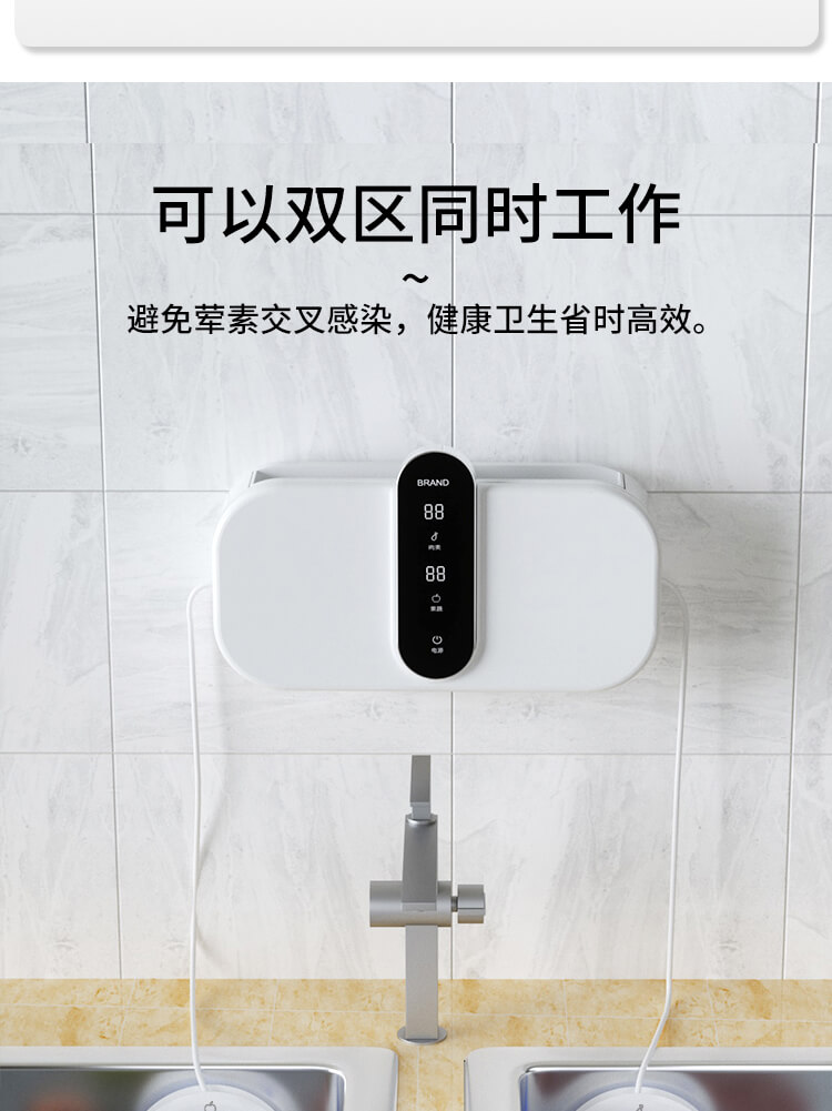 臺面壁掛雙用途,免打孔背膠設(shè)計,輕松掛在廚房任意角落,臺面放置小巧不占地方,STY23D雙倉設(shè)計,葷素雙凈同時啟動,專用果蔬、肉類點解發(fā)生器,避免交叉感染,雙凈同時啟動,省時更高效.
