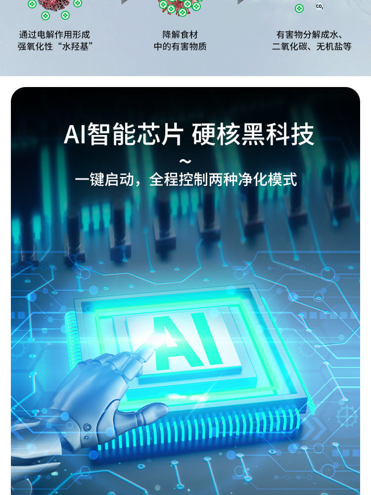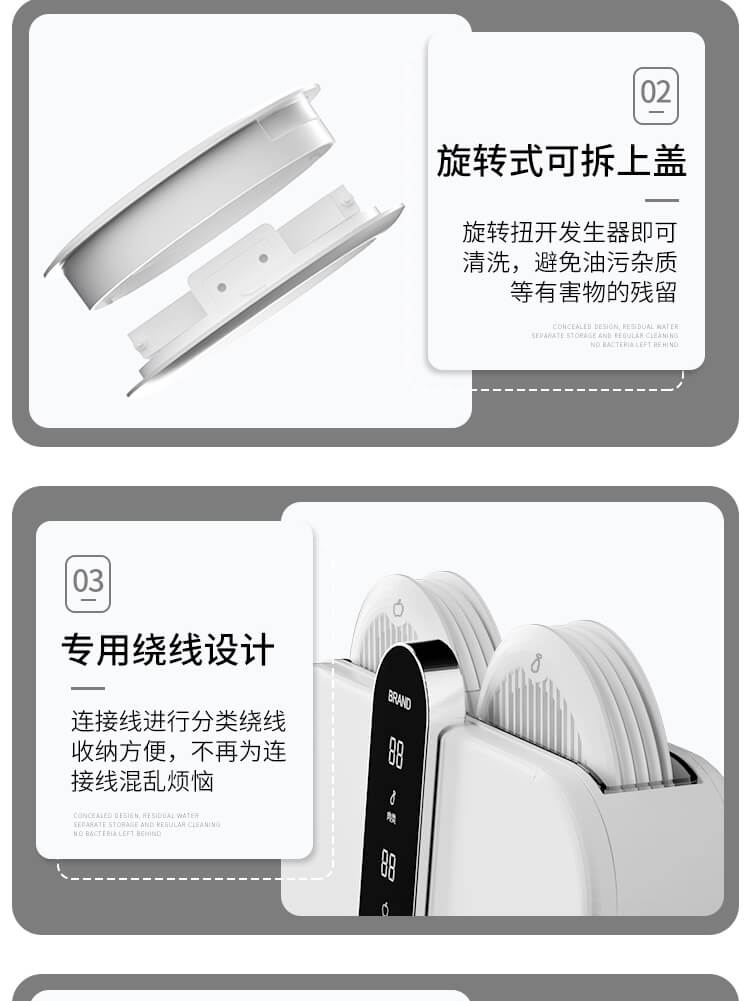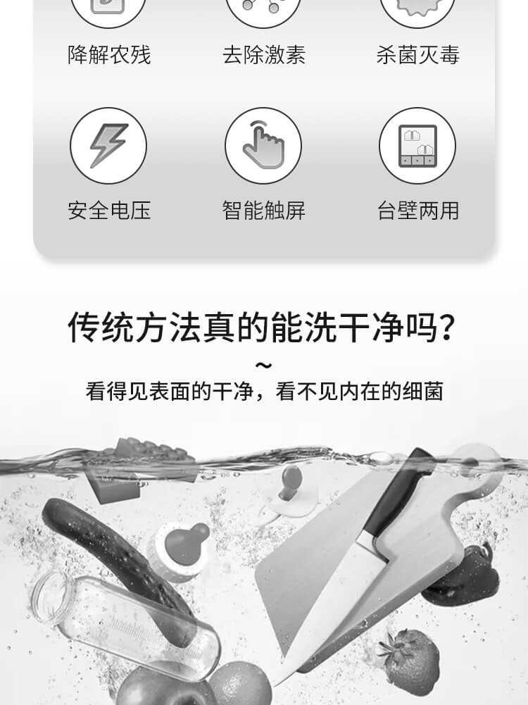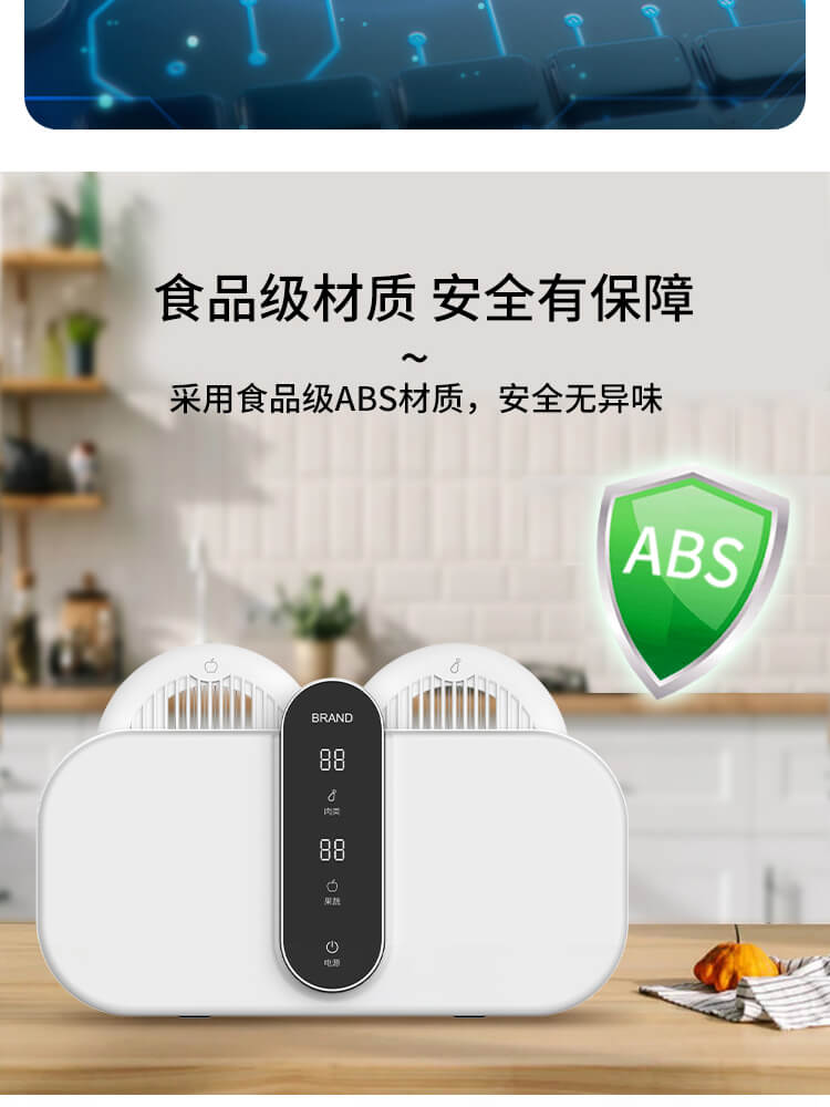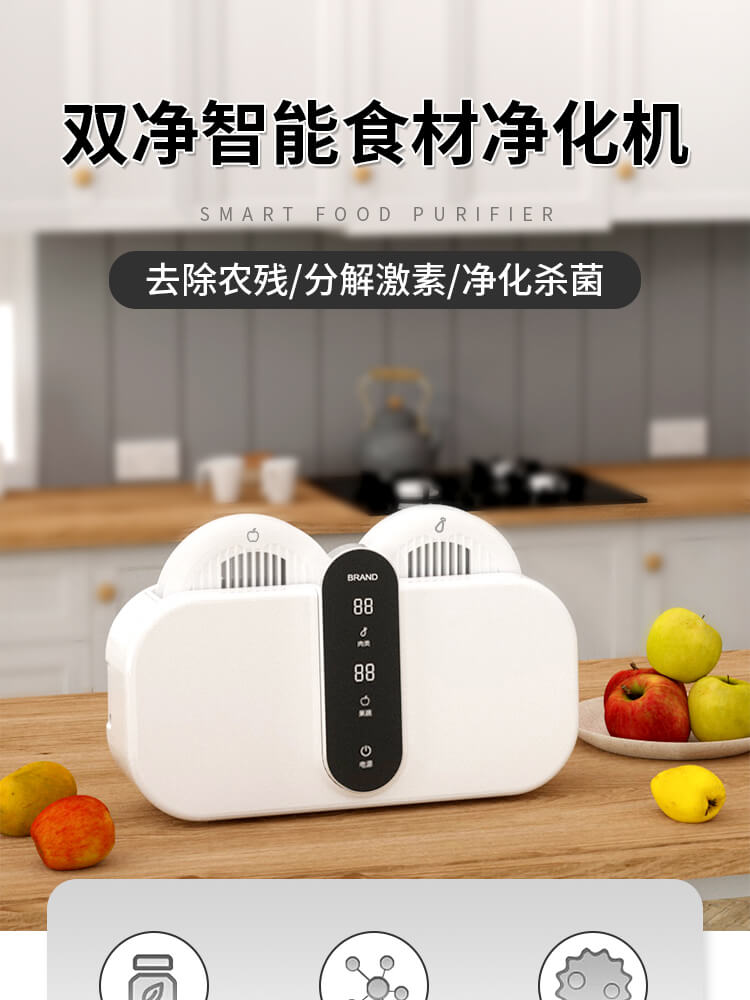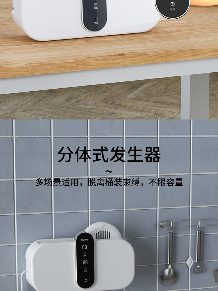 臺面壁掛雙用途,免打孔背膠設(shè)計,輕松掛在廚房任意角落,臺面放置小巧不占地方,STY23D雙倉設(shè)計,葷素雙凈同時啟動,專用果蔬、肉類點解發(fā)生器,避免交叉感染,雙凈同時啟動,省時更高效.