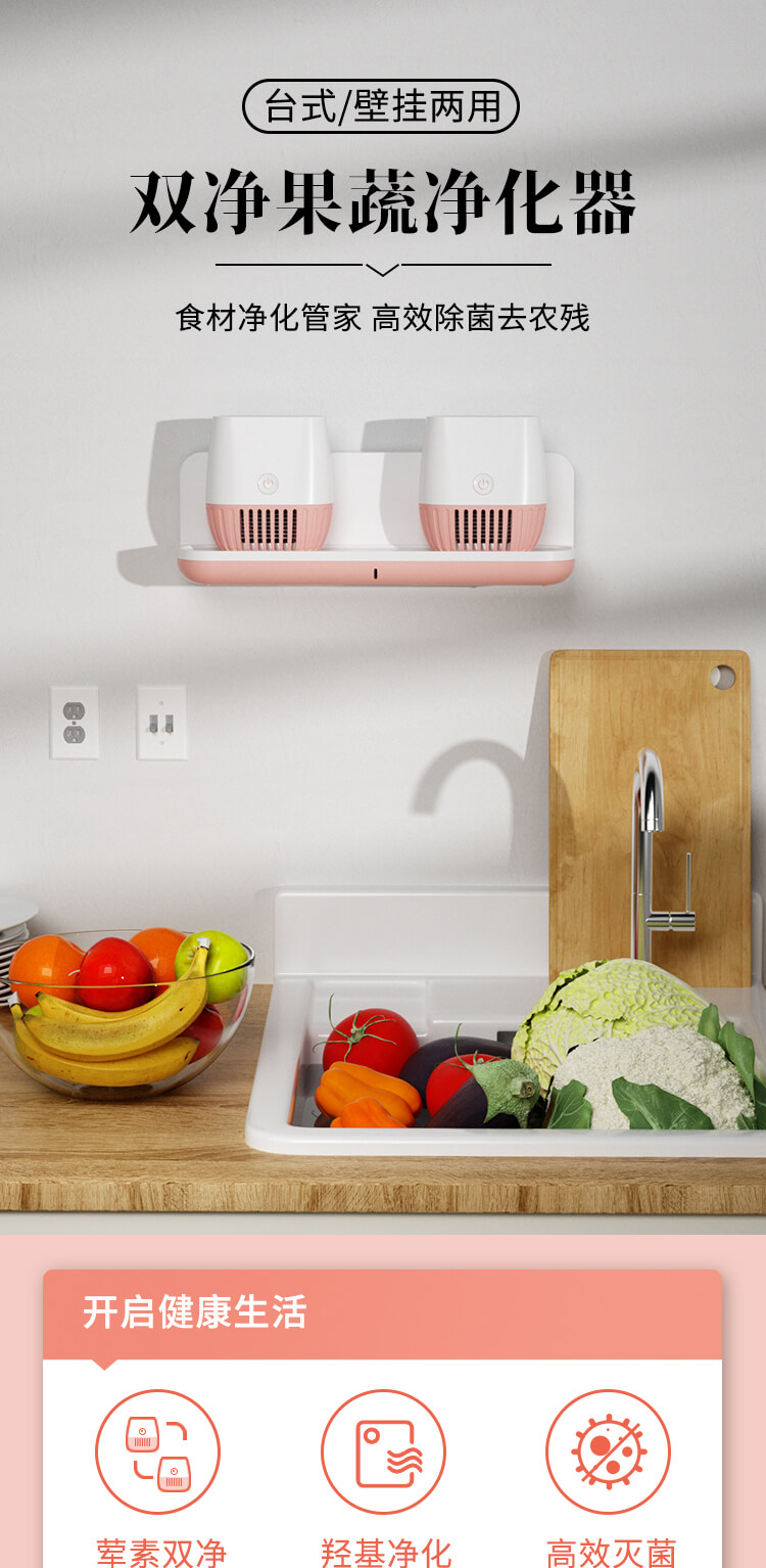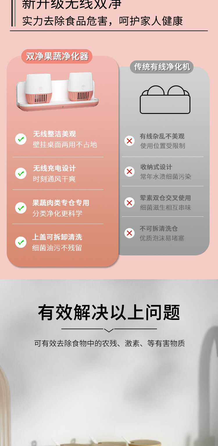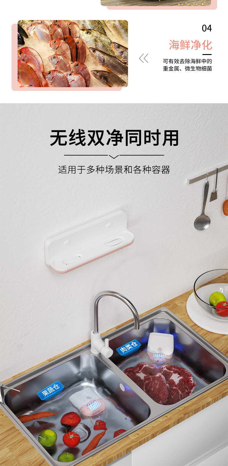 臺(tái)面壁掛雙用途,免打孔背膠設(shè)計(jì),輕松掛在廚房任意角落,臺(tái)面放置小巧不占地方。無(wú)線雙倉(cāng)設(shè)計(jì),葷素雙凈同時(shí)啟動(dòng),專(zhuān)用果蔬、肉類(lèi)點(diǎn)解發(fā)生器,避免交叉感染,雙凈同時(shí)啟動(dòng),省時(shí)更高效。
