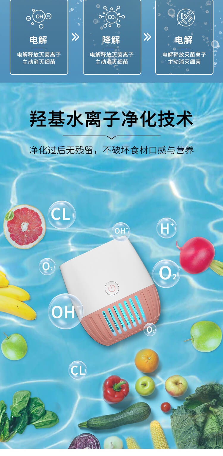 STY22果蔬清洗凈化機(jī)采用加強(qiáng)刀片電極凈化技術(shù)、航天級(jí)鈦合材質(zhì),以水為原料不添加任何化學(xué)物質(zhì),通電后產(chǎn)生粒子,使水分子裂解為羥基自由基具有強(qiáng)氧化能力,能有效的降解食材表面的細(xì)菌、農(nóng)殘、激素等有害物質(zhì)。水在離子發(fā)生器的作用下分解成OH-和H+;分解的一部分OH-將農(nóng)藥和細(xì)菌細(xì)胞壁上的H+奪走并重組,形成無(wú)害物質(zhì);另一部分OH-和水中氯結(jié)合生成次氯酸,通過(guò)氧化反應(yīng)降解殺滅細(xì)菌。